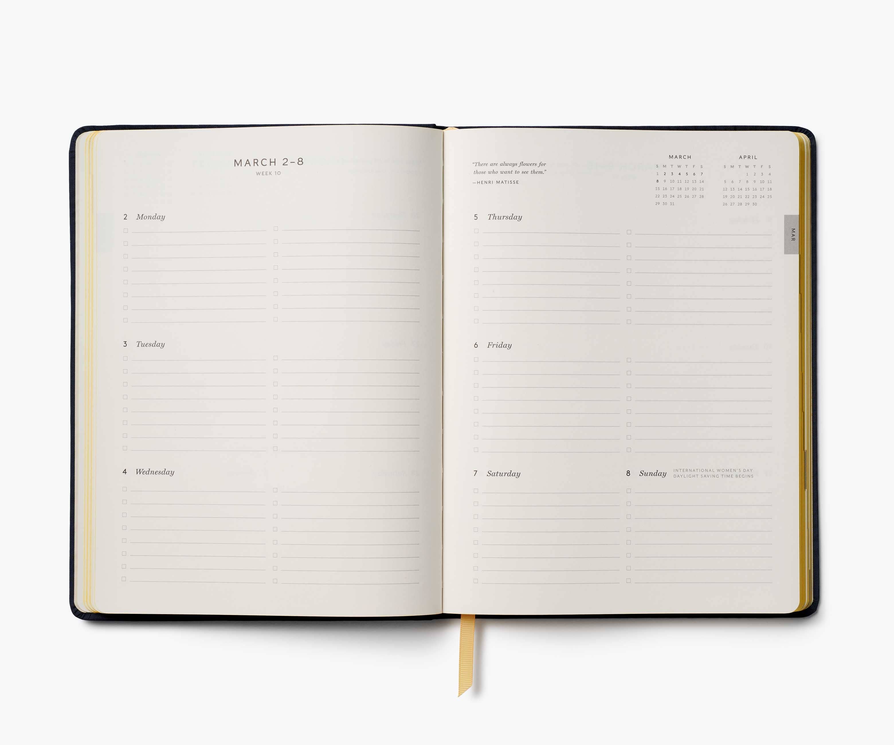A daily essential with keepsake quality. This fabric-wrapped planner features delicate embroidery, gold foil details, and a gold elastic closure, as well as weekly and monthly views, space for notes and to-dos, and a list of celebrations. Planner spans January - December 2026.