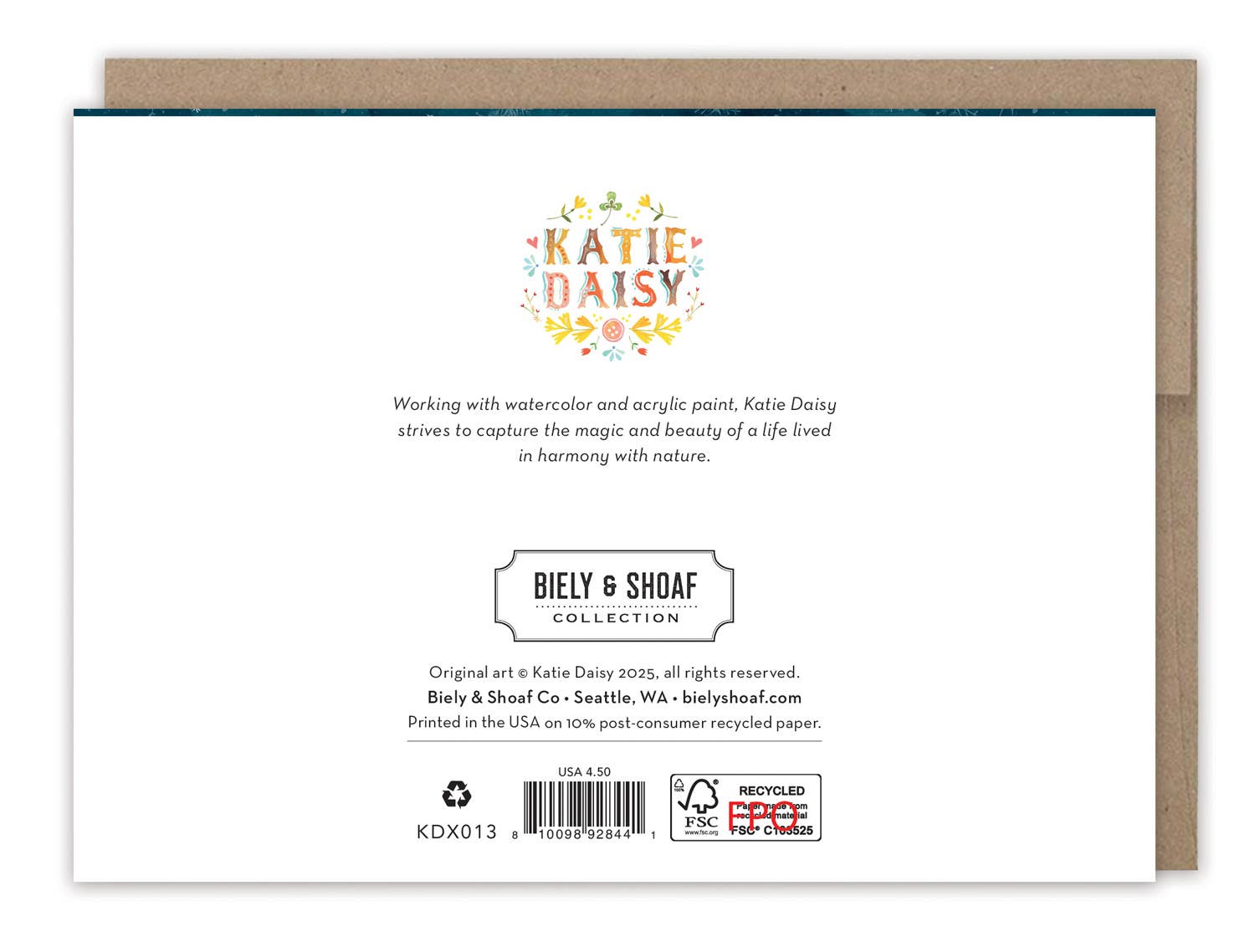 About the artist: Katie Daisy was raised by the birds and warm breezes of small-town Lindenwood, Illinois, brought up among the wildflowers with roots planted deeply in the natural world. Now residing in Sisters, Oregon, Katie continues to infuse her art with the wildflower spirit. Working in watercolor and acrylic paint, Katie strives to capture the magic and beauty of a life lived in harmony with nature.