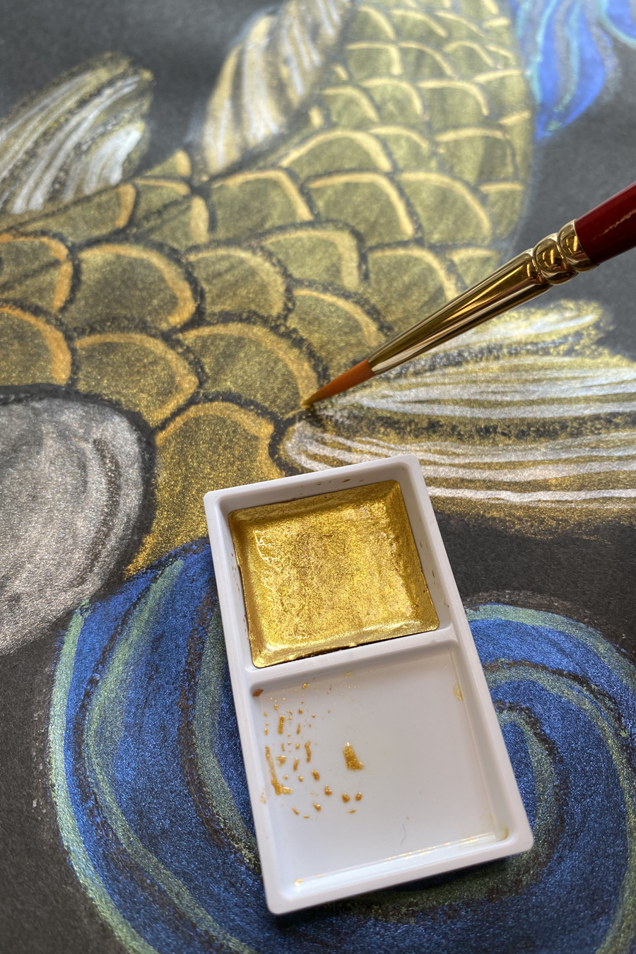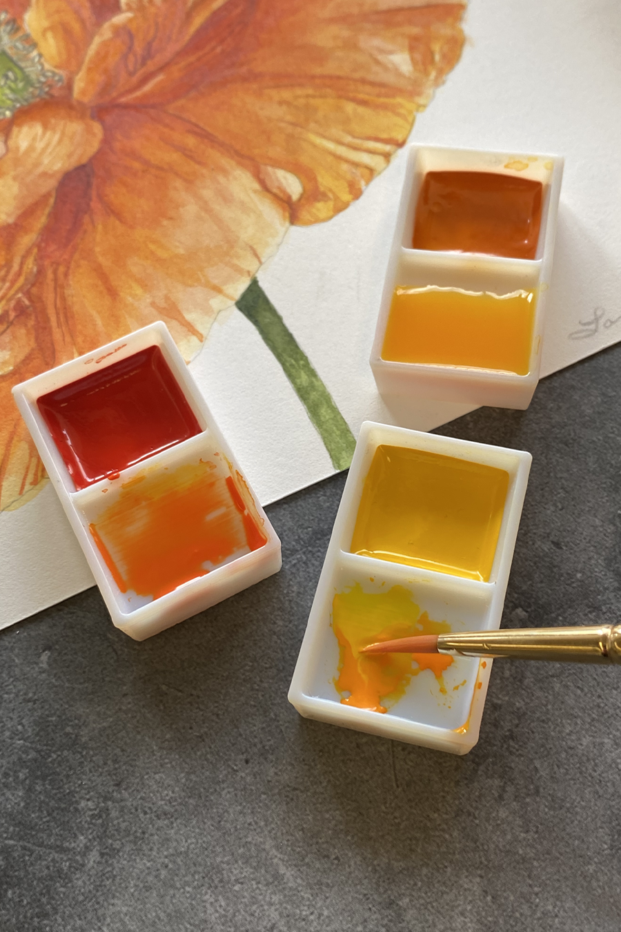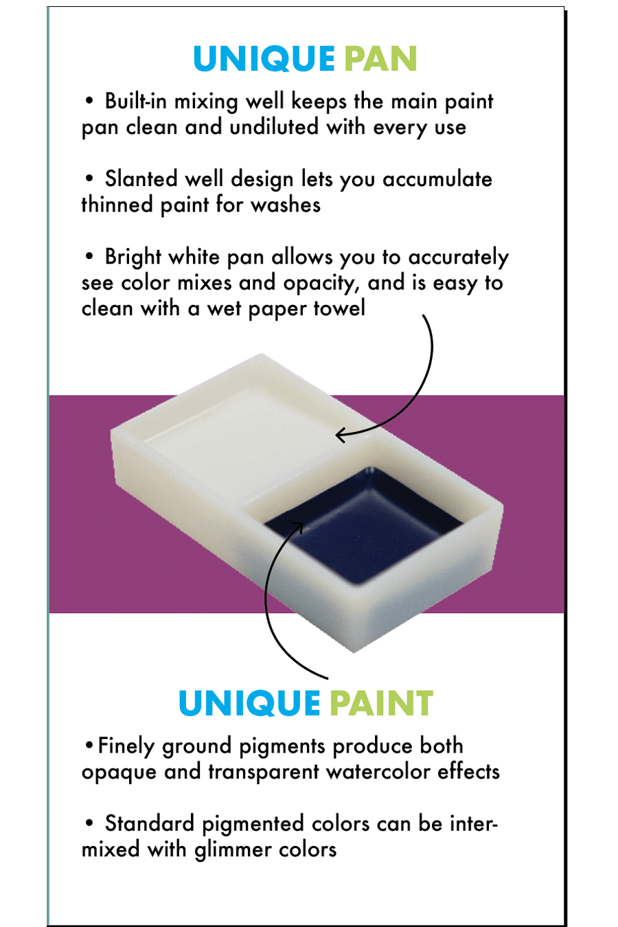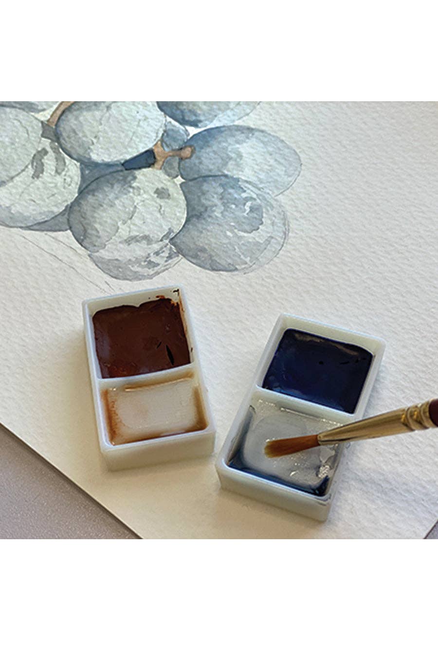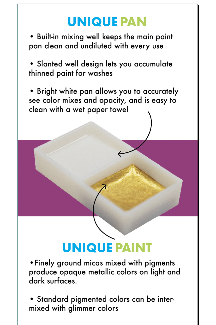 Grumbacher poured Japanese watercolor pans are made from a time-honored Eastern formula, meticulously crafted to produce brilliant, opaque bodycolors. When used in a thick, creamy consistency, the color has richness and depth that dries to an eggshell sheen, setting it apart from gouache. With a simple adjustment of water, you can achieve equally stunning yet translucent watercolor effects by thinning the paints in the pan’s mixing well.