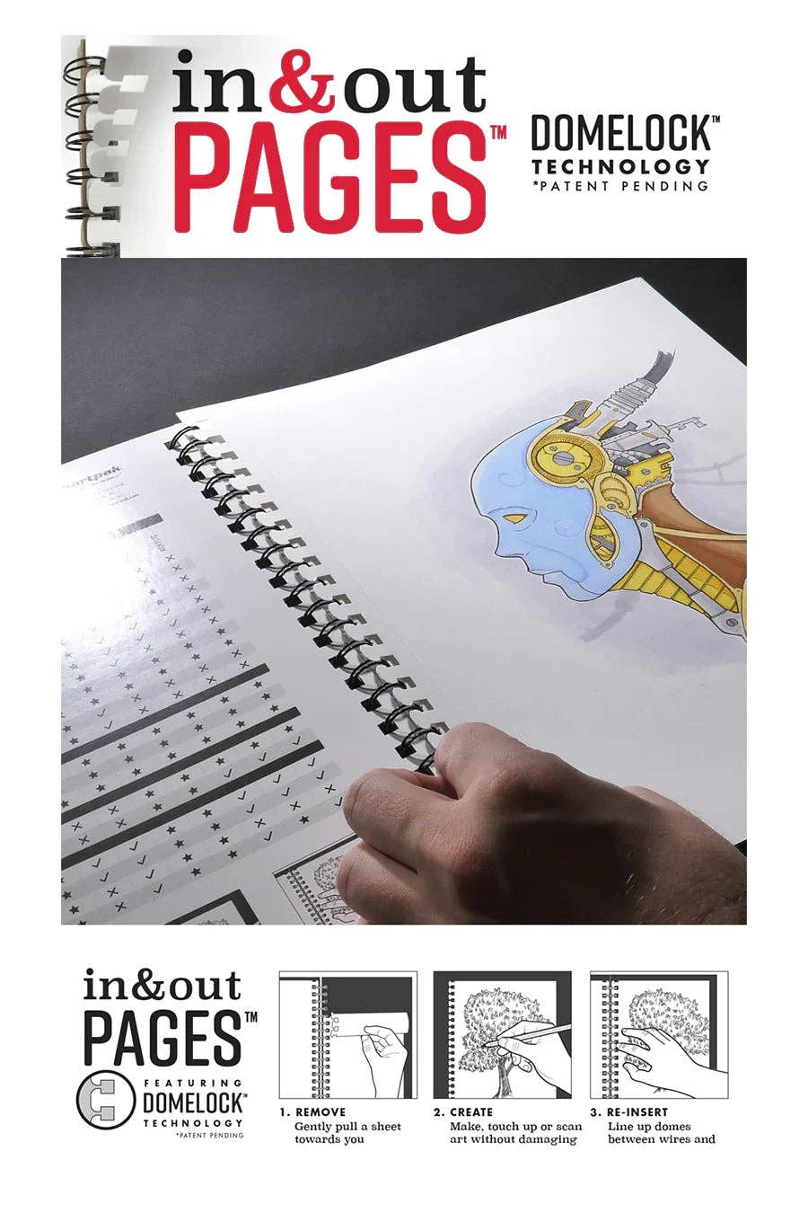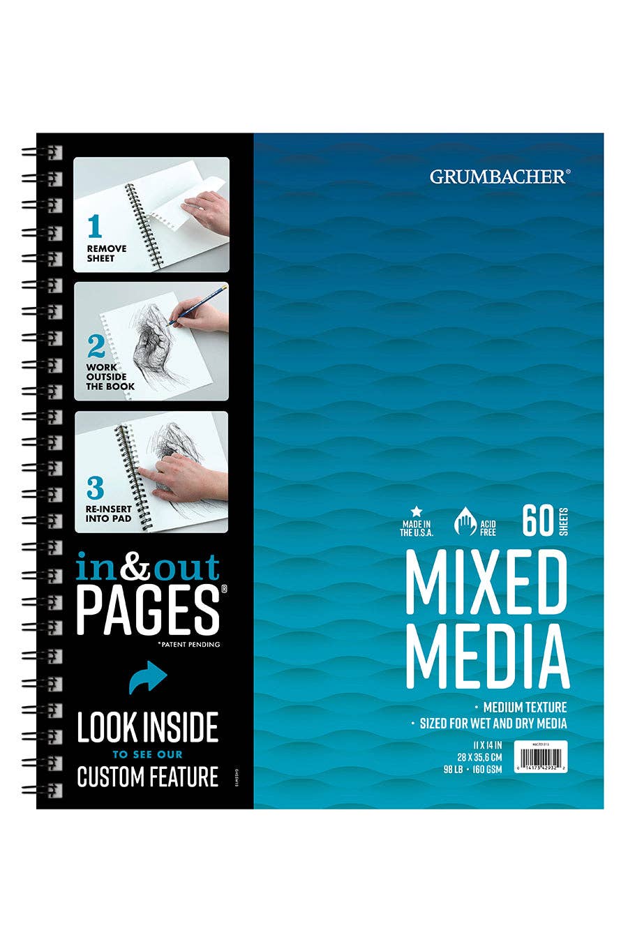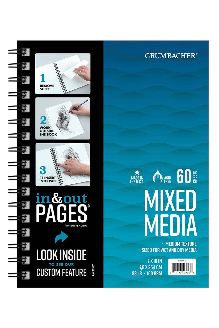 Mix media wire pads are dual loop wire bound construction and feature “In & Out” pages (patent pending) that allow you to remove sheets from the pad for painting, reworking, scanning, and more.